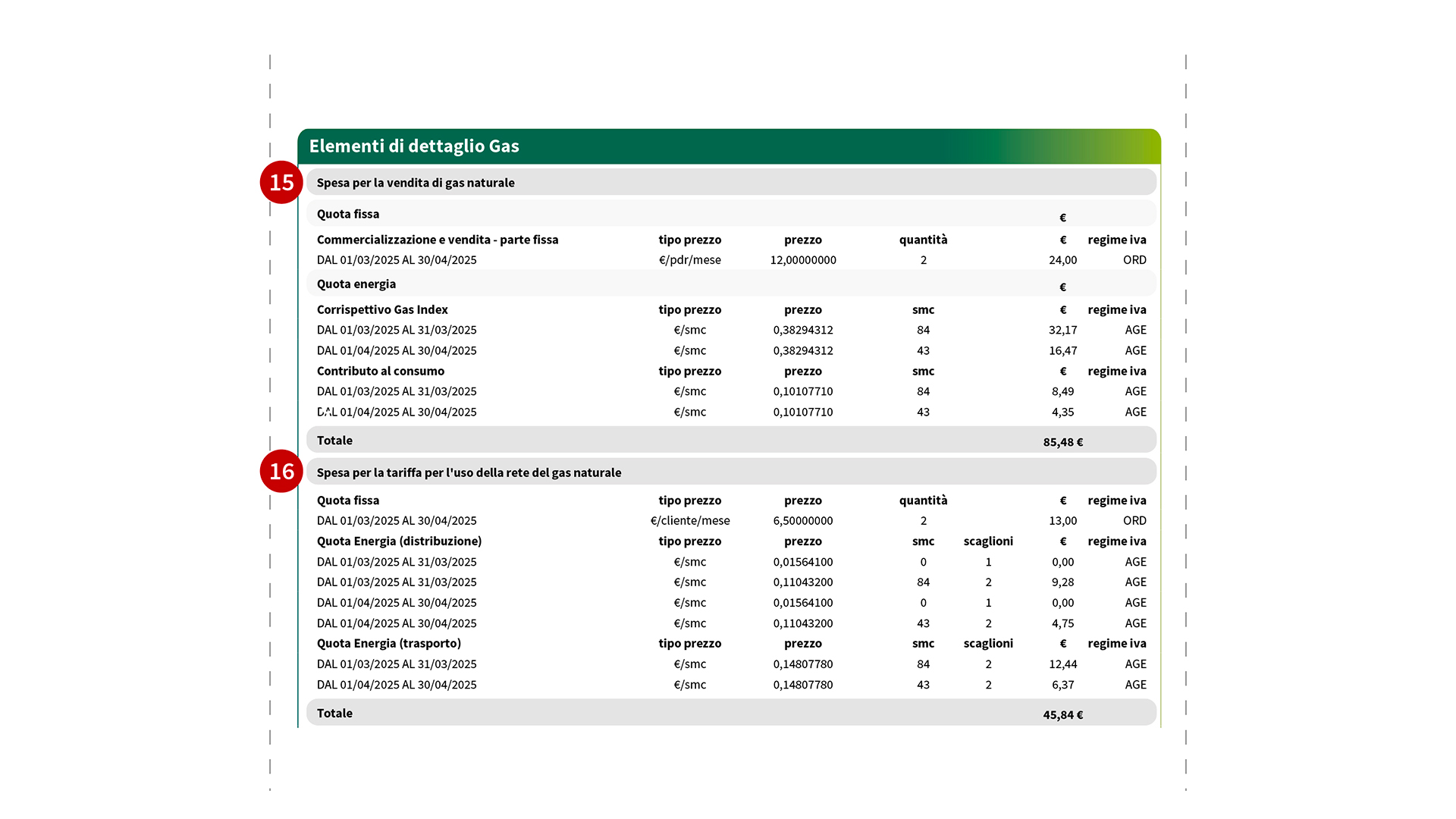 8. Uno schema semplificato degli importi fatturati aggregati secondo una struttura quantità x prezzo medio, distinguendo tra Quota per consumi e Quota fissa e, solo per il settore elettrico, Quota potenza. All'interno della singola voce di aggregazione, la Spesa per la vendita di energia elettrica è determinata in base ai corrispettivi di vendita previsti dal tuo contratto, mentre la Spesa per la rete e gli oneri generali di sistema è definita dall'ARERA, e comprende gli importi per le attività di trasporto, di distribuzione locale e di misura.