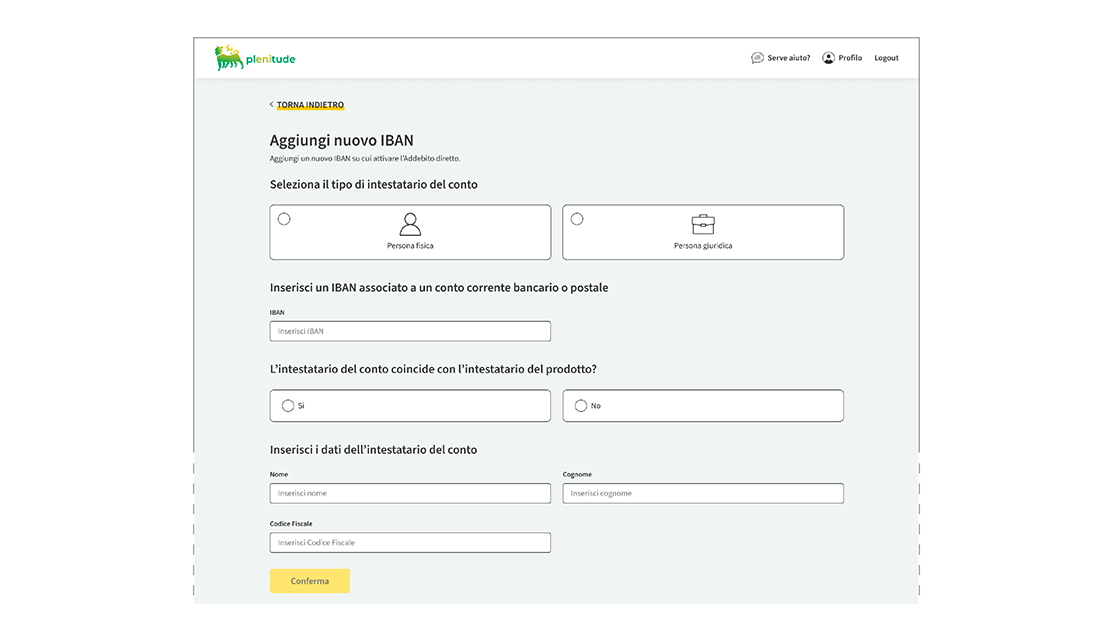 Puoi selezionare un nuovo conto corrente cliccando il bottone “Aggiungi un nuovo Iban” e inserendo i dati del conto che vuoi aggiungere come metodo di pagamento.